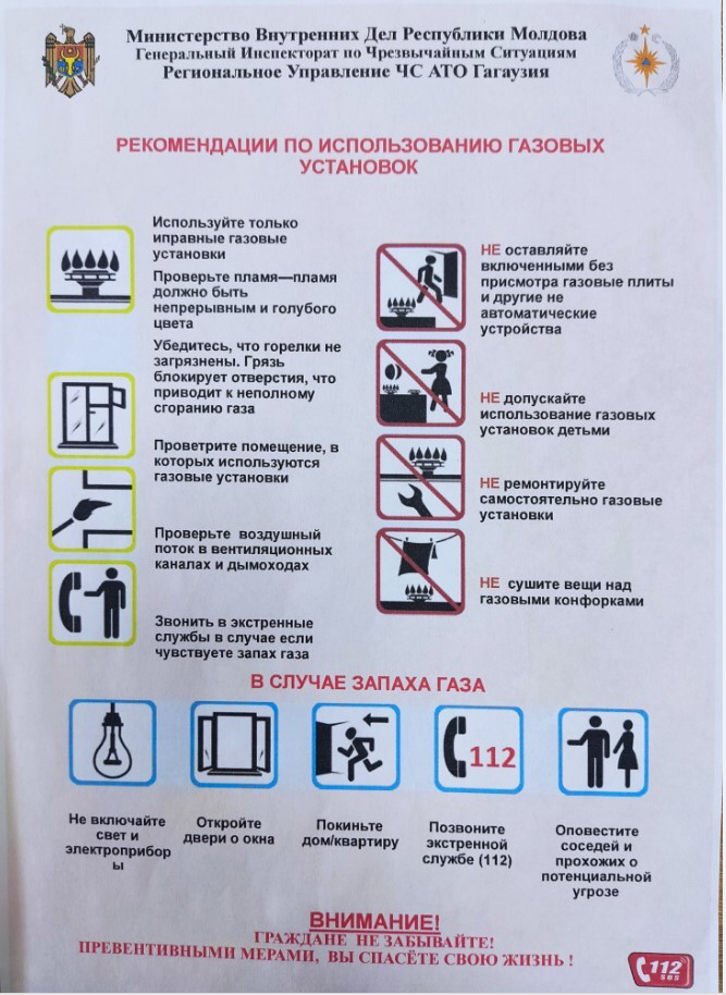 В связи с изменениями погодных условий и началом отопительного сезона Служба Предупреждения ОЧС Вулканешты РУЧС АТО Гагаузия, УБЕДИТЕЛЬНО ПРОСИТ жителей района Вулканешты: регулярно проверять дымоходы, вентиляцию и газовые установки, использовать только исправное оборудование и обращаться за монтажом только к специалистам.