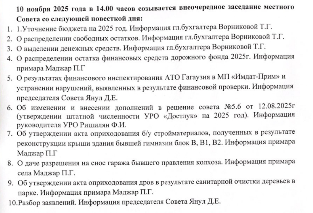 Новости АНОНС: 10 ноября 2025 года созывается внеочередное заседание местного Совета 2 месяца назад Продолжить чтение Вперед С 3 ноября начинается регистрация на компенсации за отоплениеНазад Чишмикиой участвовал на ежегодном фестивале «Gagauz Şarap Yortusu — 2025» Еще статьи Новости Медицинский полис в Молдове на 2026 год: сколько стоит и где его можно купить 15 минут назад Новости Рекомендации Службы предупреждения отдела чрезвычайных ситуаций Вулканешты 36 минут назад Новости Объявление 4 дня назад