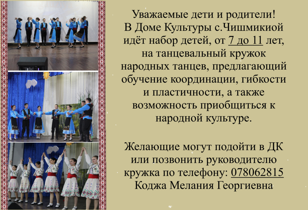 Новости Объявлен набор на занятия народными танцами 4 недели назад Продолжить чтение Вперед Храмовый праздник отметил село ЧишмикиойНазад У въезда в с. Чишмикиой начались работы по реконструкции дорожного полотна Еще статьи Новости Поздравление примара с Днем учителя 1 день назад Новости Поздравление примара Маджар П.Г. с Международным днем пожилого человека 5 дней назад Новости ПРЕДУПРЕЖДЕНИЕ О ПОГОДЕ 5 дней назад