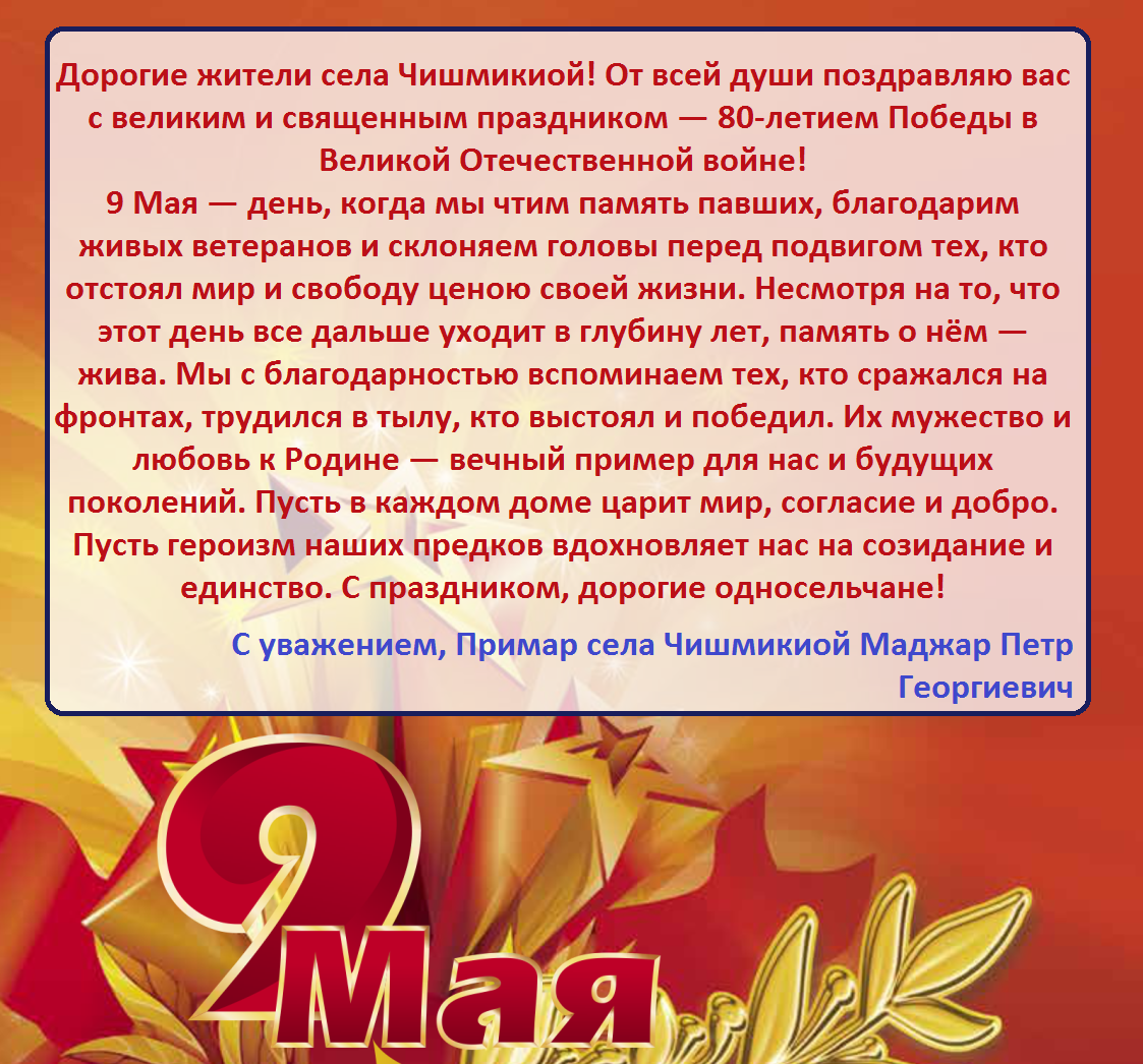 Новости Поздравление примара с Днем Победы 5 месяцев назад Продолжить чтение Вперед Программа мероприятий на 9 маяНазад В Чишмикиойе прошел митинг в честь 80 годовщины Победы в Великой Отечественной войне. Еще статьи Новости Праздничный концерт ко Дню учителя прошел в селе Чишмикиой 3 часа назад Новости Поздравление примара с Днем учителя 1 день назад Новости Поздравление примара Маджар П.Г. с Международным днем пожилого человека 5 дней назад